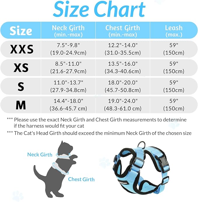 - Cat Harness with Leash, Fits Average Cats: Size measuring:Neck Girth: 8.5 -11 Inches, Chest Girth: 13.5 - 16 Inches. Please measure your cat carefully and refer to the size chart before order. (Tips: Your cat's head circumference should be at least 10 inches or your cat may slip out.) Package includes: 1x Small Cat Walking Vest and 1x Walking Nylon Leash (150cm)