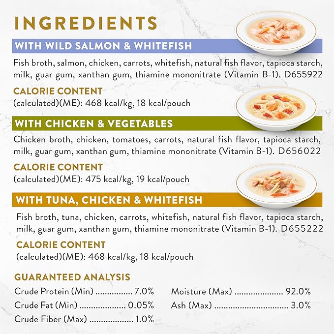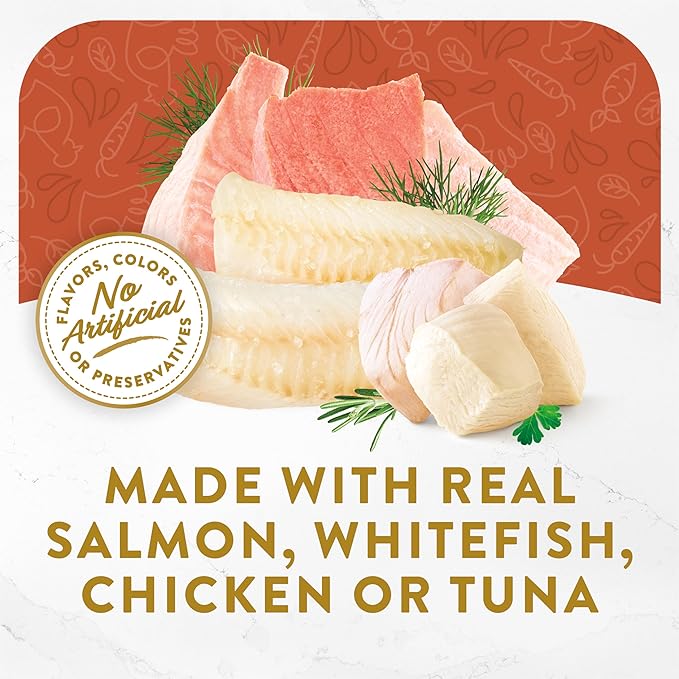 - Premium adult cat food toppers made with real wild salmon and whitefish, chicken and vegetables or tuna, chicken and whitefish in a creamy broth for a delicious taste cats love