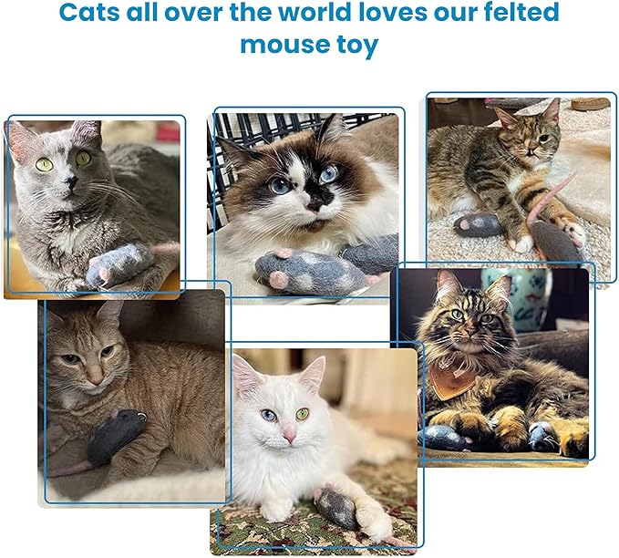 - DURABLE & SAFE MATERIAL: Our Feltcave Wool Cat Mouse Toy Without Catnip is made of safe materials. The fabric is durable enough to withstand cats chewing or biting. The mouse's nose, eyes, and ears are all made with 100% felt. This toy is sized similarly to a real tiny mouse and is lightweight, allowing cats to pick up and carry it around the house quickly!