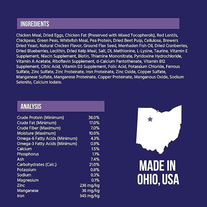 - NUTREINT-DENSE GRAIN FREE FORMULATION - A holistic blend of antibiotic-free chicken for lean muscle development, whitefish rich in omega-3 fatty acids for skin and coat health and cranberries for urinary tract health Enriched with taurine