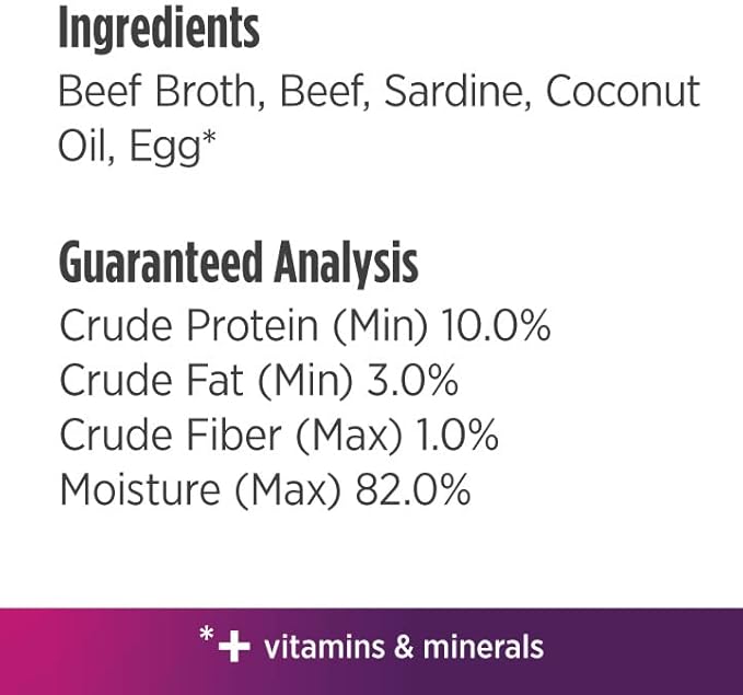 - BEEF & SARDINE RECIPE - Great nutrition has a new texture. Pamper and please your cat with a delicious, nutritious, and satisfying meal. Pack of 24, 2.8 Oz each.