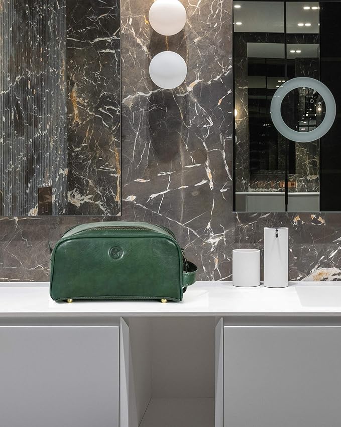 10" Premium Leather Toiletry Travel Pouch With Waterproof Lining | King-Size Handcrafted Vintage Dopp - Kit ~ Gift for Father's Day By Aaron Leather Goods (Basil Green)
