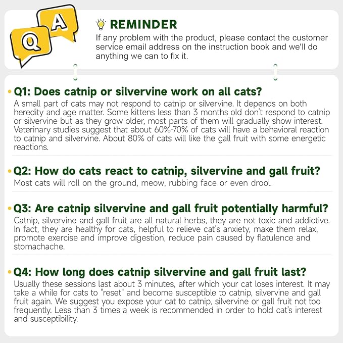 - Blend of 4 Flavors: 1 cat energy ball and 3 cat treat balls, which are blend of catnip, silvervine and gall fruit, could be good to enhance cats' vitality and appetite, relieving boredom and depression effectively. Catnip not only makes kittens happy but helps excreting hairballs. The cat treat balls include catnip, gall fruit, sticky rice and enriched silvervine
