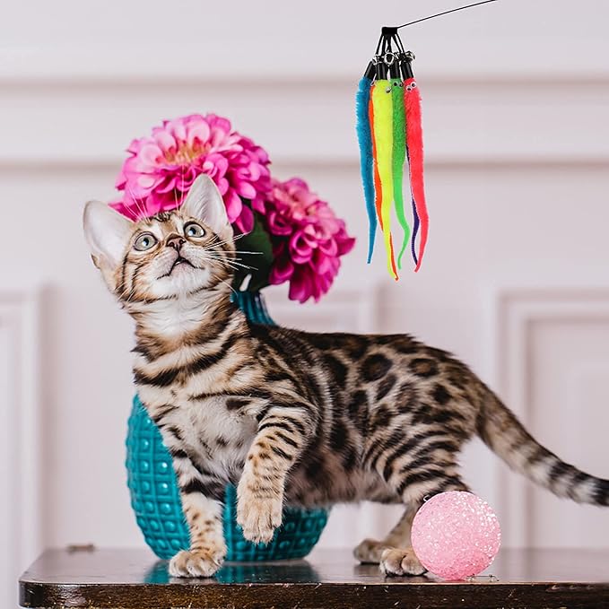 - GREAT VALUE - We have 12 pcs in two combinations for your choice (6 Colors: Green, Blue, Purple, Pink, Yellow and Orange). Cat will never get bored again chasing the same old feather or even worm.