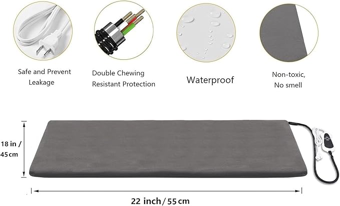 - Safety and Security ---- No need to be concerned about overheating. Dog heating pad features 7 layers of protective construction. UL approved heating wire to protect your pet from burns, and the pad will automatically turn off when the temperature exceeds 131°F. One year guarantees. If you not satisfy, please contact us freely. We will resend a new product for you.