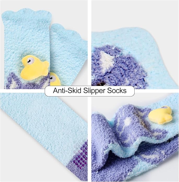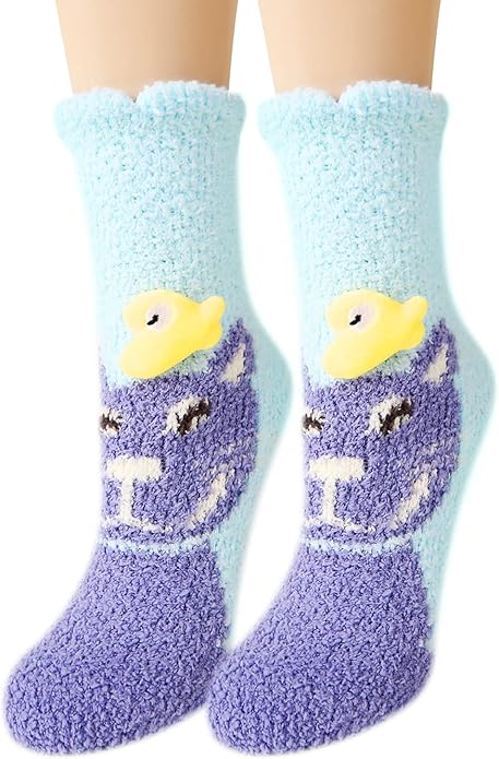 - 【Cat Fuzzy Socks】Each pair funny cute slipper floor fuzzy socks have an unique 3D cartoon design, including cat, sheep, giraffe, alpaca, llama, cow, bear, duck, dog, leopard, panda, raccoon. If you are a pet lovers, you will have so much fun when you wear these fun socks, such novelty silly patterned design add personality and vigour to your life. Some thick warm fleece home socks has grips on the sole, will prevent you from losing balance and falling.