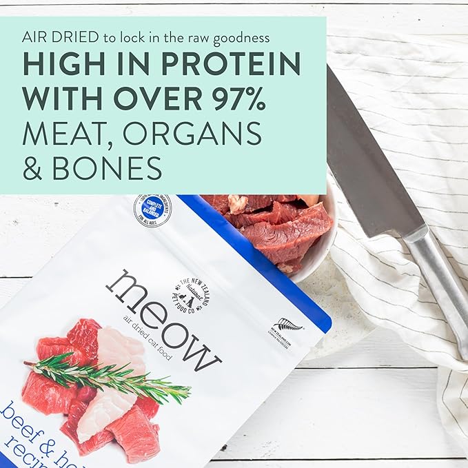 Meow Air Dried Cat Food - Beef & Hoki Recipe, High Protein Dry Cat Food Use as a Complete Diet, Topper, Mixer, or as Cat Training Treats, All Life Stages, 3.5 oz