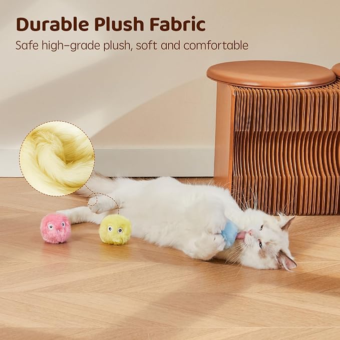 - Built to Last – Pets are famously cute AND messy. Luckily, the 3 cat toy balls are made from durable and highly resilient plushy materials which endure each aggressive wrestle; Plus, plush materials are soft and safe for cats. And the built-in batteries make each cat toy ball last 10,000 times of chirping