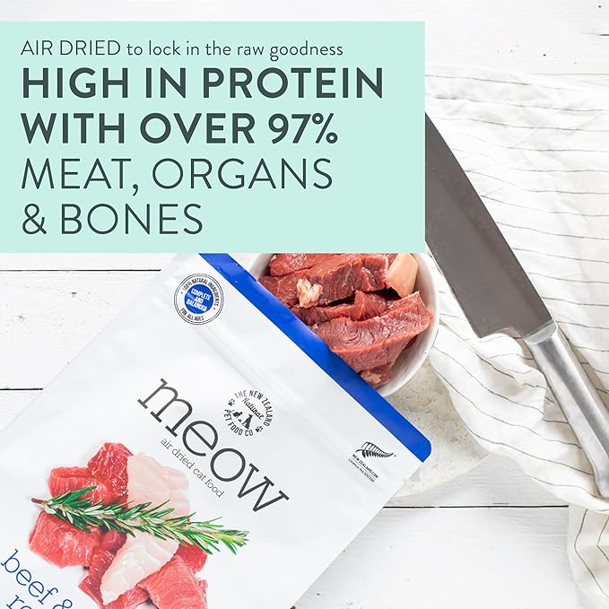 Meow Air Dried Cat Food - Beef & Hoki Recipe, High Protein Dry Cat Food Use as a Complete Diet, Topper, Mixer, or as Cat Training Treats, All Life Stages, 26.5 oz
