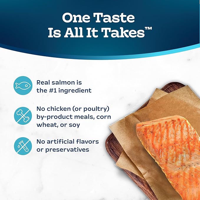- DELICIOUS SALMON FIRST: The first ingredient in this natural Blue Buffalo cat food is tender cuts of high-quality salmon in a savory gravy your cat will love
