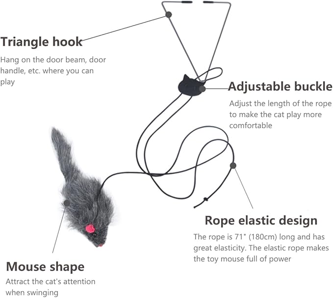 - 【Adjustable and durable】The elastic rope of this hanging cat toy extends from 10" to 70.8" (1.8m) and is made of thick, abrasion-resistant material. Even if your cat bites off the rope, you can still tie it back on for longer life.