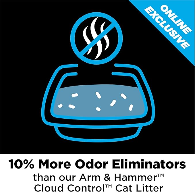 - POWERFUL: With 10% more odor eliminators than our regular ARM & HAMMER Cloud Control cat litter, this breathe-easy clumping litter eliminates urine and feces odors on contact.