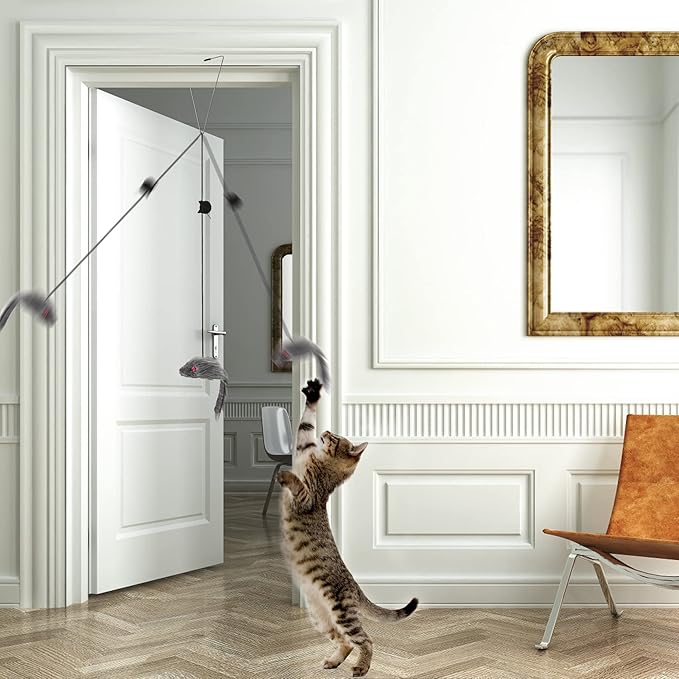 - Adjustable-Elastic: Using elastic rope, the length can also be adjusted through the device to adjust to the appropriate height, the mouse will be pulled by the cat and fly around, trying to catch but not being able to catch, it will make the cat crazy