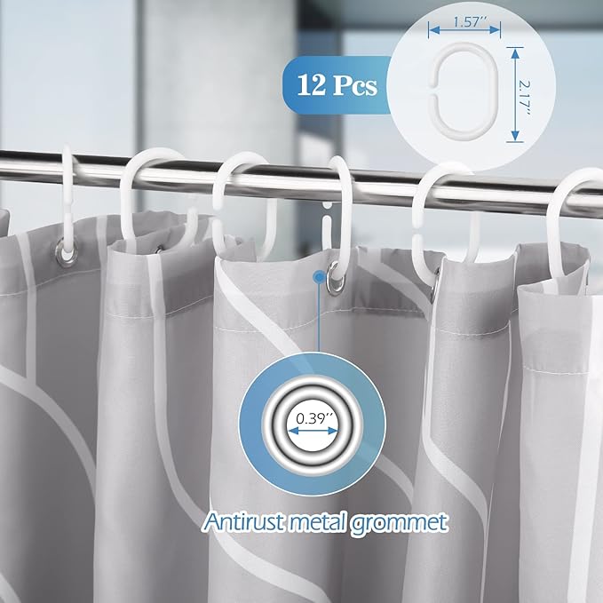 - Easy To Install: The shower curtain has grommets at the top to fit most standard shower hooks. Each Aimego bathroom curtain includes 12 PCS hooks. Using the top grommets and hooks, the bath curtain can be quickly hung on the rod and slide smoothly without jamming. Quick and easy removal when you want to clean or replace the shower curtains