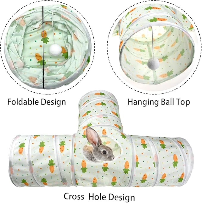 Vehomy Bunny Rabbit Tunnels Rabbit Cat 3 Way Collapsible Tunnel with Cute Carrot Patterns Small Pet Hideout Activity Tunnel Tube Toy for Bunny Kitten Cat Dwarf Guinea Pig T Shape