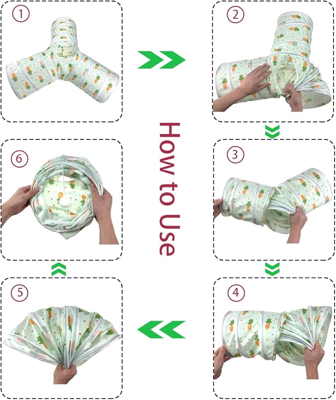 - 【Durable Material & Cute Pattern】Our bunny tunnel toys are made of suede fabric that is bite and scratch resistant, and is supported by flexible iron wire circle that is steady and foldable. Please don't wash it by machine due to the iron wire frame. On the bright green bunny tubes, there printed cartoon carrots and dots, very cute and unique.