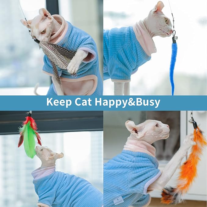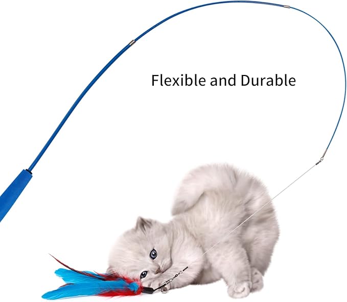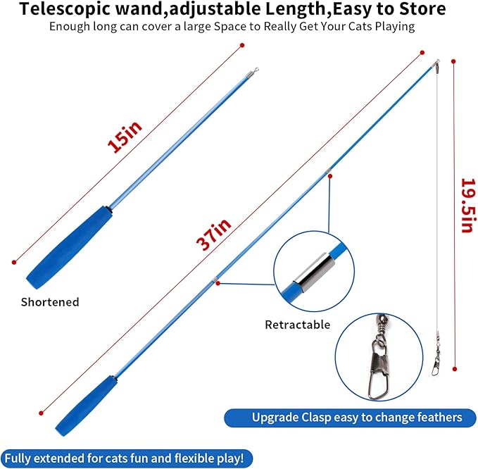 - Cat Toys for Indoor Cats:1pcs cat wand+11pcs feather teaser refills, Variety feather teaser attachments make this cat toy used for longer periods of time, cat wand toy is adjustable from 15 Inches to 38 Inches, with 20 Inches string, it’s long enough to cover a large space to play and can really get your cats exercise.