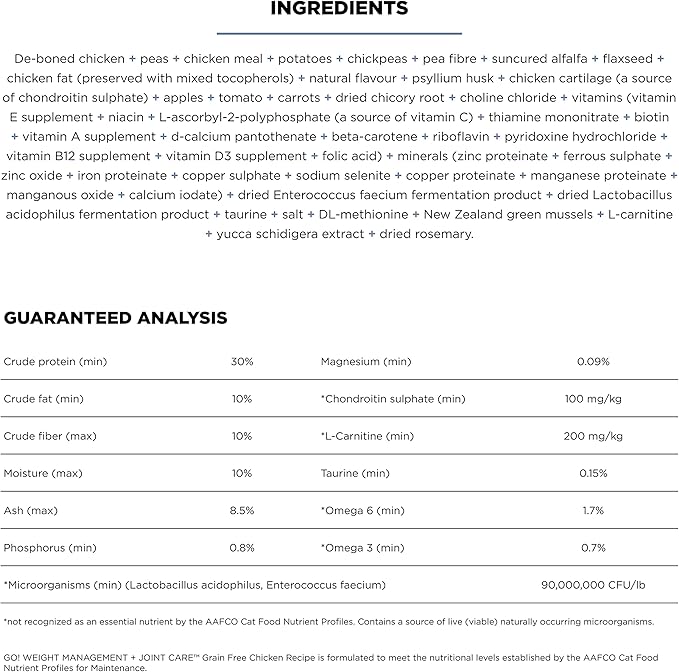 - Supports healthy weight + joints. With up to 50% less fat than other GO! SOLUTIONS recipes for cats, plus L-carnitine to help burn fat and chondroitin from chicken cartilage to support healthy joints, this recipe can help your cat stay active and fit.