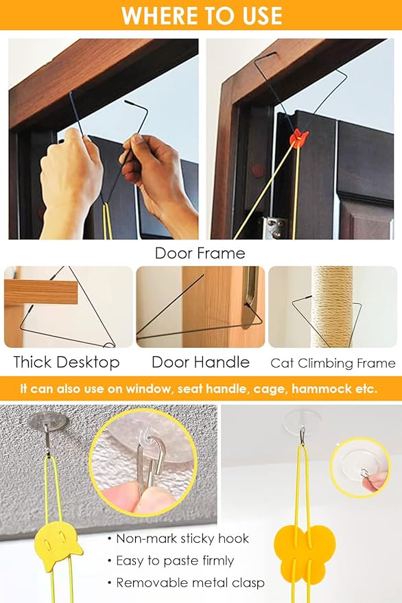 - 🐁 Triangle Hook & Non-mark Sticky Hook - The rope mouse toy can be hung on door beam, door frame, door handle seat, chairs, cages, etc by triangle hook or non-mark sticky hook. No matter how hard your cat playing, it will not fall. It keeps your cat engaged for self entertainment that is not connected to you. You only need to hang the toy somewhere in the room to let the cats have fun.