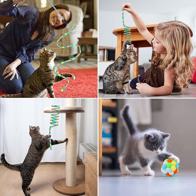 - 【Cat Toys Interactive for Indoor Cats】This interactive cat toy set combine cat springs,pom pom balls, cat teaser wand toy.Cat wand and ball all have a small bell is an irresistible lure,attract the attention for cats! Swing this ribbon " lure" will get your cats excited and bring out the " hunt instinct",help your indoor cats to flip, jump, pounce, chase. Great way to get your cats energy out and do more exercise while playing