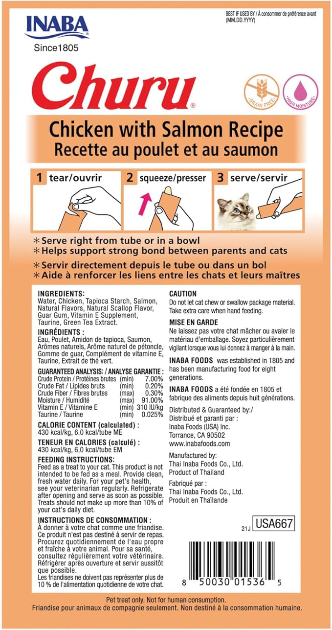 INABA Churu Cat Treats, Grain-Free, Lickable, Squeezable Creamy Purée Cat Treat/Topper with Vitamin E & Taurine, 0.5 Ounces Each Tube, 24 Tubes (4 per Pack), Chicken with Salmon Recipe