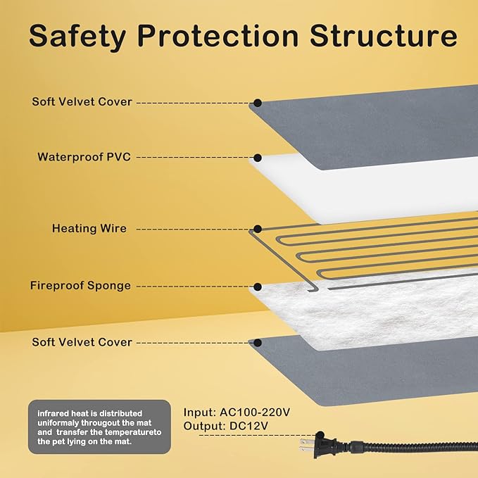 - Safety and UL-certified :Our cat warming pad outdoor Heat Pads for Cats Inner PVC with the highest-grade V-0 flame retardant capability and waterproof. The outdoor heating pad for feral cats 7-layer protective structure with UL-certified heating wire protect pets from burns, 100% safety guaranteed Built-in intelligent temperature sensor in the heating pad to prevent overheating.