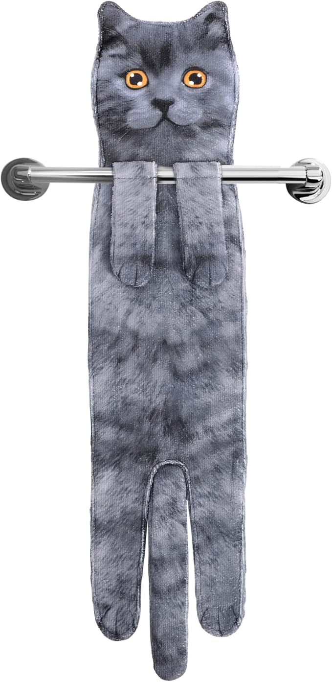 - Cute Cat Hand Towel:Funny cat towels hanging on a towel rack,the snap button of the cat's hand prevents the towel from slipping off.When you wipe your hands with the feeling of touching a cat's belly,you will be healed by the soft fabric touch!The pattern on the back,tail and paws are very realistic,so cute that even the towels also make you want to hug them!