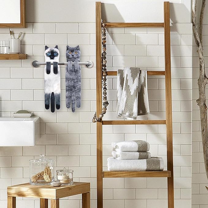 - Perfect Decorative: 25 inch by 6 inch. Maybe you are worrying that your bathroom and kitchen are too boring?It's time for you to have a cat washcloths to decorate them,make your home full of warmth and vibrant. Cat hand towels not only dry your water droplets, but also give you the companionship of a cat,add some fun to your bathroom and release your tiredness!