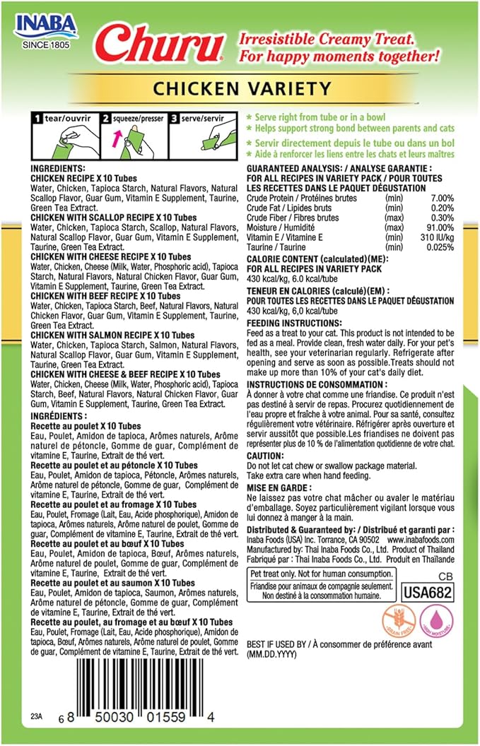 - MADE WITH WHOLESOME INGREDIENTS YOU CAN TRUST: Every Inaba product is made with yummy ingredients including farm-raised chicken and/or wild-caught tuna