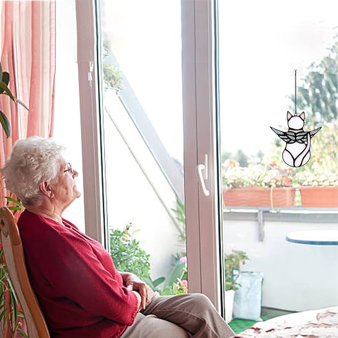 - PET CAT MEMORIAL: This is a pet memorial suncatcher for any cat lover. Great for cat stained glass window hanging on windows, cars, walls, living room shelves, cabinets, porches, balconies, front doors and bedrooms