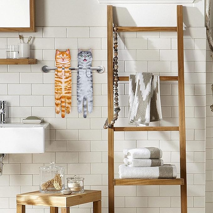 - Perfect Decorative: 25 inch by 6 inch. Maybe you are worrying that your bathroom and kitchen are too boring?It's time for you to have a cat washcloths to decorate them,make your home full of warmth and vibrant. Cat hand towels not only dry your water droplets, but also give you the companionship of a cat,add some fun to your bathroom and release your tiredness!