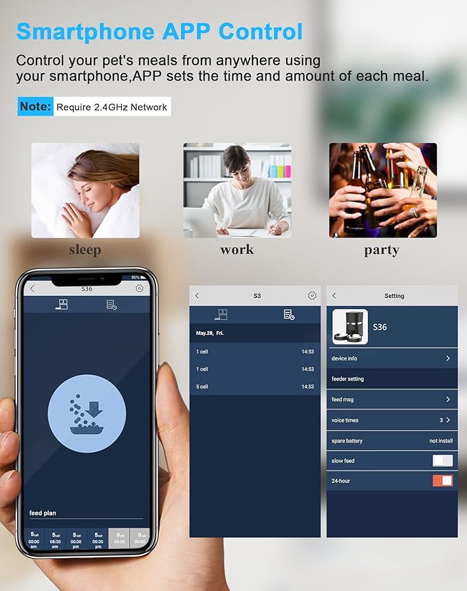 - 【Smart Feeding Setting】The automatic feeder supports APP for IOS and Android systems. First, connect the automatic cat feeder to Wi-Fi (only supports 2.4GHz network), and then you can make a feeding plan through the mobile phone APP and remotely control and feed your pet. The operation is simple, in addition, the feeding plan can be manually set on the feeder without the network.