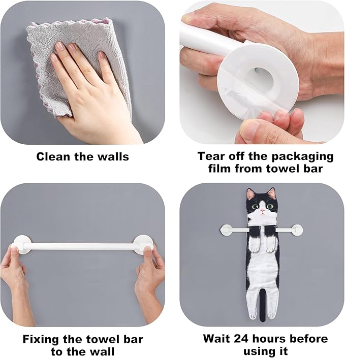 - High Quality Fabric: Products include towel bar and cat hand towels.Cat hand towels are made of 85% polyester 15% nylon,soft and comfortable fabric with strong water absorption. It is suitable for wiping hands and face.The cat head with special materials,so that when hanging can stay upright!(Note:For the installation of the towel bar, please refer to Figure 5 for details.)