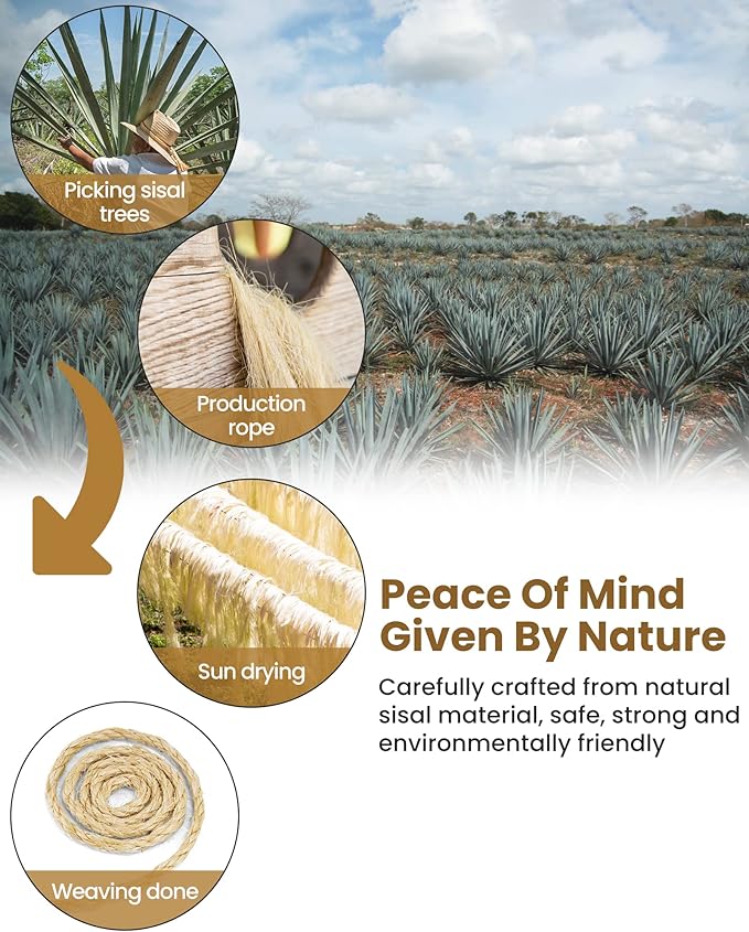 - 100% NATUREAL MATERIAL: Made of high quality natural sisal plant.No odor, no chemicals, Environmentally friendly and biodegradable.We guarantee that the product has no chemical ingredients added, and you will get a pure natural sisal rope that is harmless to cats and human beings