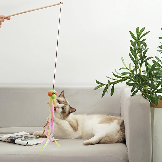 - HAPPY CAT HAPPY OWNER - This cat wand has everything cats love - ribbons, a bell, Pom Poms and a wooden handle
