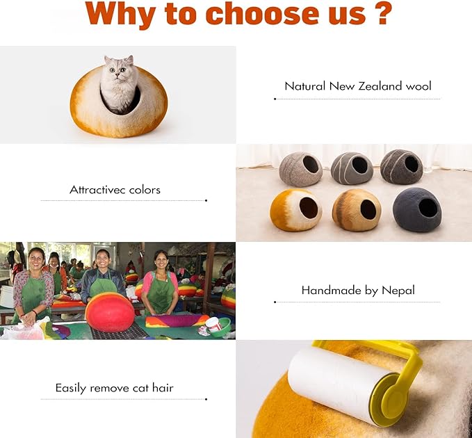 - Handcrafted Cat Cave:Each cat cave bed is handcrafted by crafters in Nepal.it is made of wool, its good for cold weather as this will keep them warm.the cave cat bed gives your pet a touch of privacy and creates a good sense of security, the ideal cat hideaway. the cave comes with a mouse toy