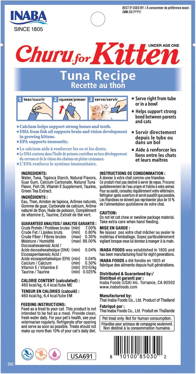 INABA Churu for Kittens, Creamy, Purée Lickable Cat Treats with DHA, EPA, Vitamin E & Taurine, 0.5 Ounces Each, 24 Tubes (4 per Pack), Tuna Recipe