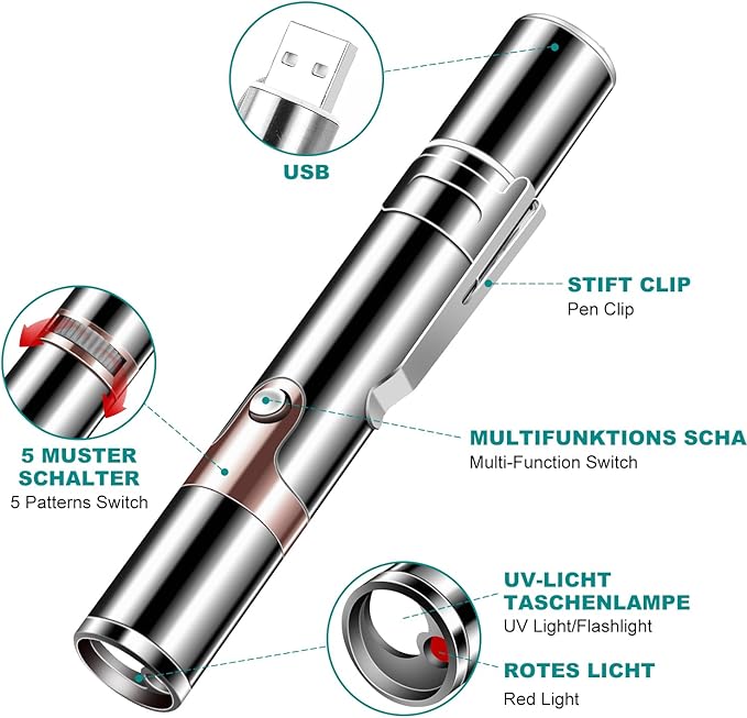 - 7 in 1 mode:This cat toy has 5 modes: red dot, mouse, butterfly, smiley face, and star. Toggle the black gear on the head to change into 3 different modes: red light, violet light and flashlight. You can use the violet light to check for counterfeit money and check your pets. This cat pointer also has a flashlight function, which can be used in many occasions. You can also use it as a remote pointer for PPT presentations.