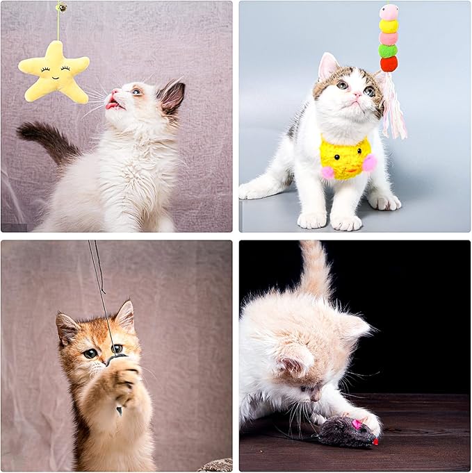 - 【Safe & Durable Materials】Our mouse toy surface is made of plush fabric, soft and safe. Starfish & caterpillar toy is made of soft cotton.All toys are made of environmentally and safe materials.This cat wand toy is made of high quality,safe,non-toxic,Eco-friendly material.The feather is from nature