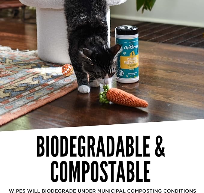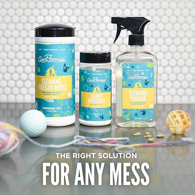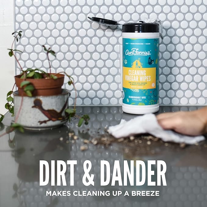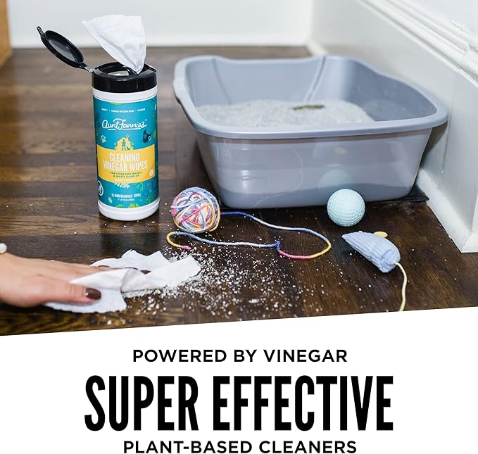 - Aunt Fannie's Vinegar Cleaning Wipes for Cat Odors and Messes: Contains 35 bright lemon scented wipes for the convenient clean up of dirt, dander and other kitty messes on household surfaces