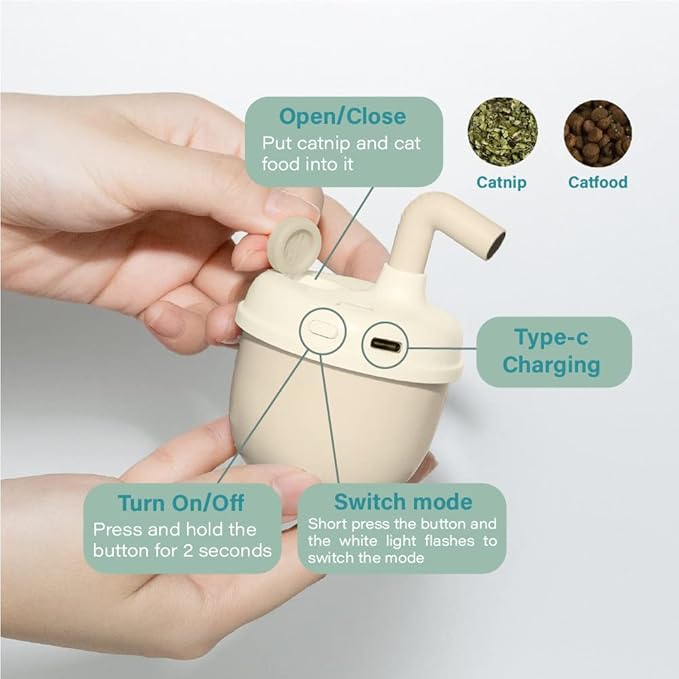 - Concerned that your cat might have no interest in this bubble tea interactive laser toy? Don't worry! Our cat toy is specially designed with a opening to hold cat treats or catnip, creating a simulated hunting scene that provides rewards for your cat during playtime. Watch as your feline companion becomes a skilled hunter, chasing the elusive laser dot and enjoying the playful hunt with satisfying rewards.
