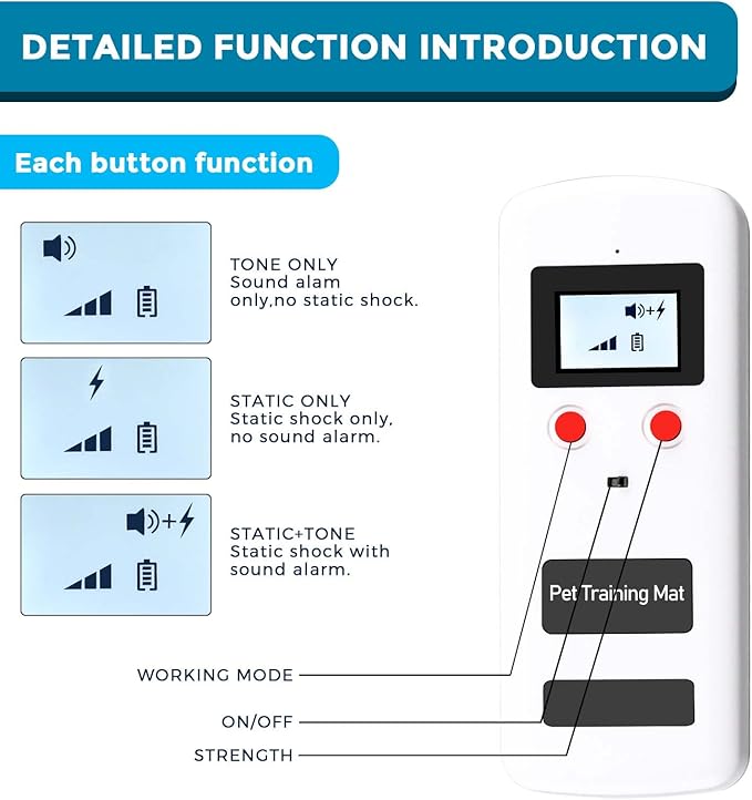 - 【3 WORKING MODES】 LCD screen pet shockproof pad 3 optional training mode; The pet training pad provides three optional training modes (static mode, buzzer mode, and static+buzzer mode). You can easily manually change the impact level from low to high; Just choose the right level of electric shock for your pet to reduce static electricity to your pet during behavior correction