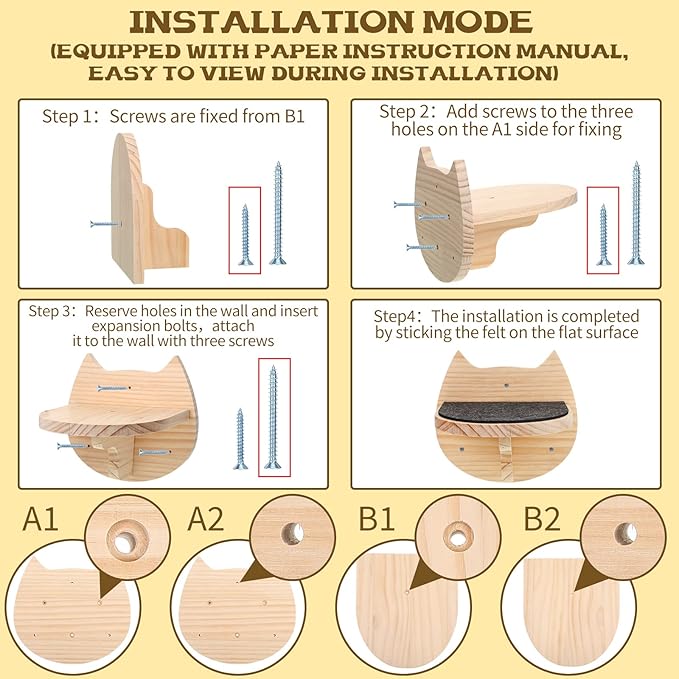 - Fine Workmanship: the cat steps for wall are composed of wood material, also equipped with screws and wall anchors, sturdy and firm, not easy to break, deform or fade, has no unpleasant odors or burrs, serviceable for long time use; Also equipped with a felt mat, your cat will be happy to play with it