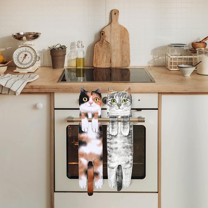 - Cute Decorative: 25 inch by 6 inch. Tired of boring bathrooms and kitchens? Maybe it's time for you to have a cat towel to liven them up,make your home full of warmth and vibrant. Cat hand towels not only dry your water droplets, but also give you the companionship of a cat,add some fun to your bathroom and release your tiredness!