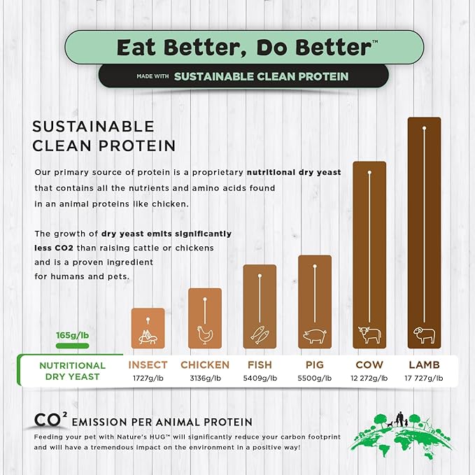 - SUSTAINABLE COMPLETE PROTEIN – Our primary source of protein is a dry yeast that contains all the nutrients and amino acids found in animal proteins like chicken. The growth of dry yeast emits significantly less CO2 than raising cattle or chickens and is a commonly used food ingredient.