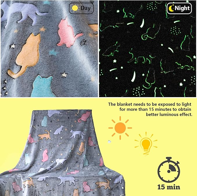 - This black dream cat kittey blanket for girls is very suitable for children aged 1-10. It can glow at night to create childlike nights for children. It only needs to be placed for 10 minutes or more under any light source, which can provide its luminous function. The brighter the light, the stronger the blanket in the darkness.