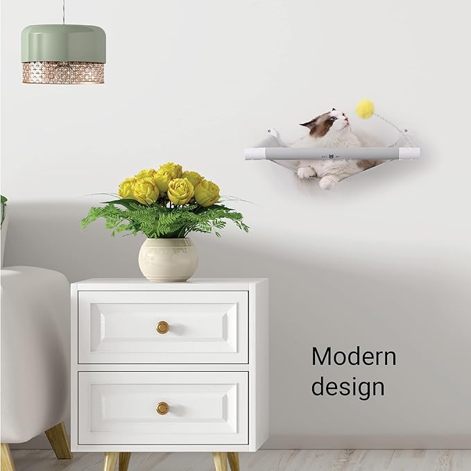 - PLAY & RELAX - Our wall-mount cat furniture comes with a fluffy ball on springs for your cat to play with. There is built-in support for a canopy (sold separately, coming soon) for your cat to snuggle under.