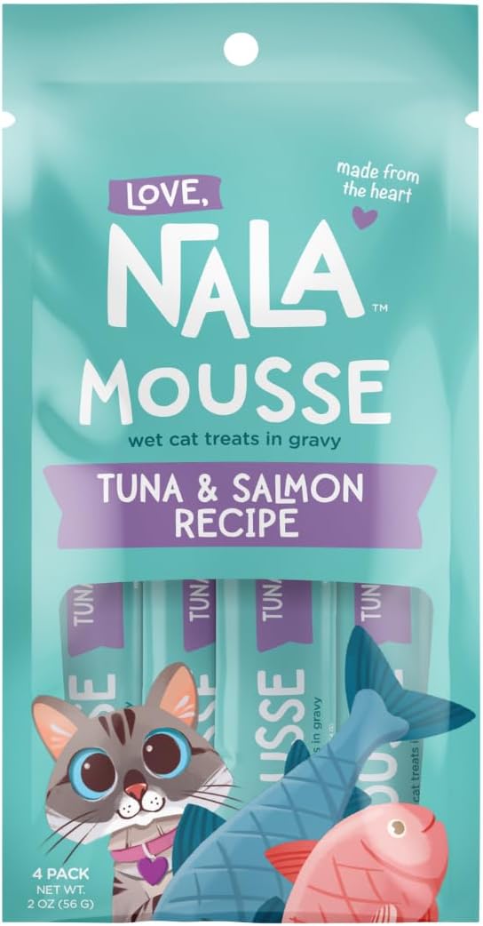 LOVE, NALA - Natural Lickable Cat Squeeze Up Treat,Topper - Tuna & Salmon Mousse - Wet Food Cat Puree - Grain Free, Fiber Blend, Minerals, Vitamins - 4 Pack 2 oz.