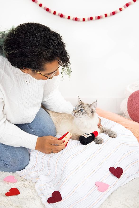 Pearhead Pet Cheese and Wine Plush Cat Toys, Set of 2, Valentine's Day Dog Toys, Wine and Cheese Catnip Toys, Crinkle Cat Toys, Cat Owner Valentine's Day Keepsake