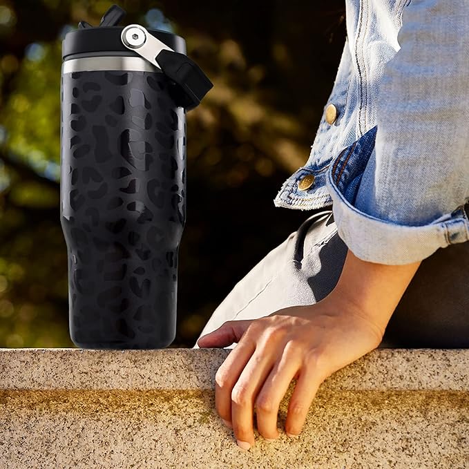 30oz Black Leopard Tumbler with Handle and Straw, Stainless Steel Vacuum Insulated Coffee Tumbler, Travel Mug Water Bottle, Leopard Stuff Accessories Decor, Leopard Gifts for Women